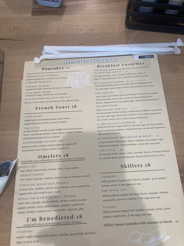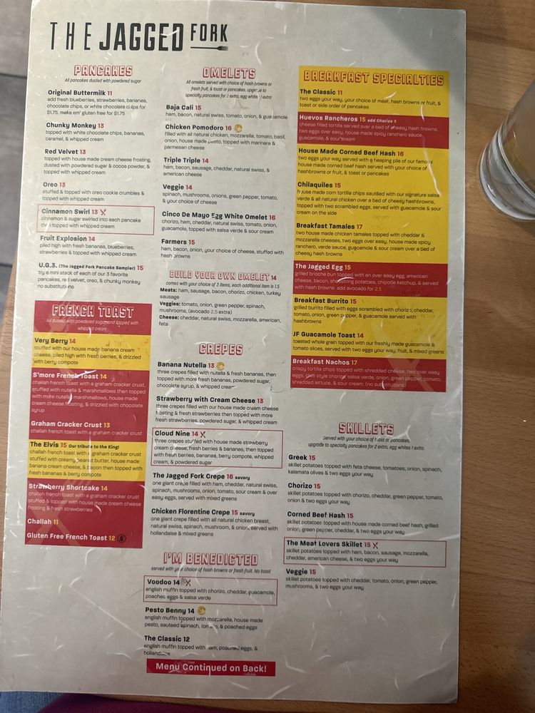 “ The Jagged Fork is a great place to stop by for breakfast/lunch! It was my first time visiting and I had a good experience. Our waitress was very friendly and offered some suggestions on their menus. She was very knowledgeable in what they had to offer. My husband and I decided to share their quesadilla and verde fries. It was a good decision to share because their portion size is huge! We enjoyed it all though. The quesadillas was packed with cheese and vegetables. The verde fries came piled high with toppings. The wait was a little long since it was a weekend morning and they are a breakfast place that closes at 3. But when we visited it was more around lunch time, or else I would have tried some of the breakfast choices they had. I'd definitely love to come back and try their other items! Everything on the menu sounded amazing! ”