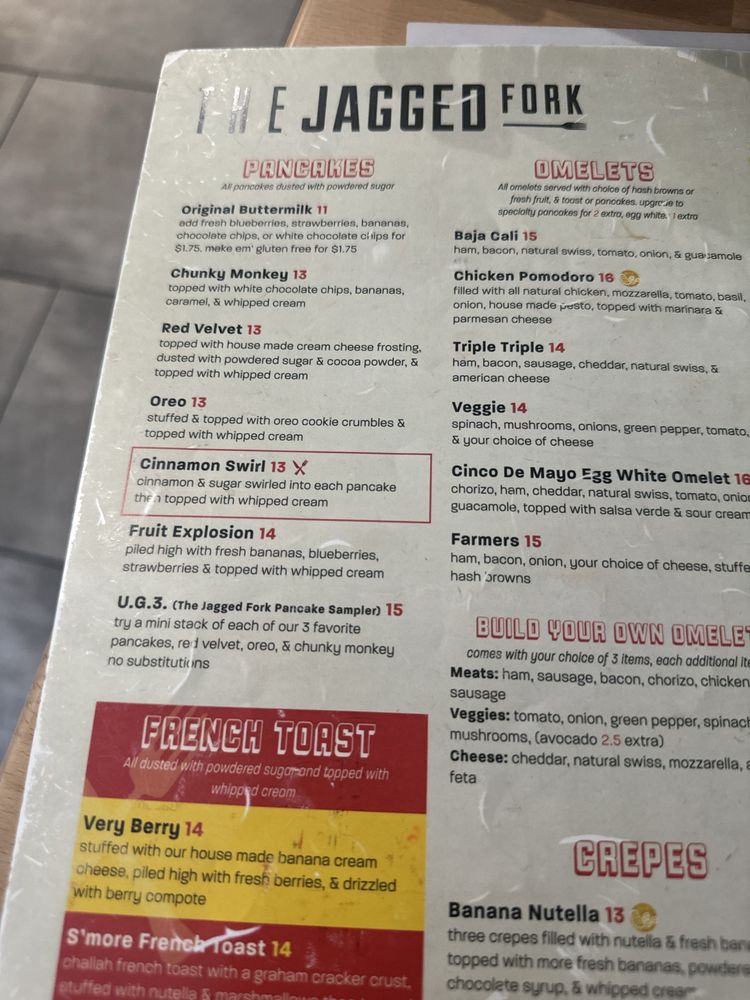 At The Jagged Fork, variety is the spice of life. From delightful pancakes to delectable omelets and hearty skillets, the menu is crafted to satisfy every palate. With a plethora of options, including vegan and vegetarian dishes, there’s something for everyone. The standout pancake upgrades have earned rave reviews, much like Mark P. who shared, “This is our new breakfast spot…” The consistency in quality and flavor is evident in every bite, making each dish a celebration of breakfast tradition.